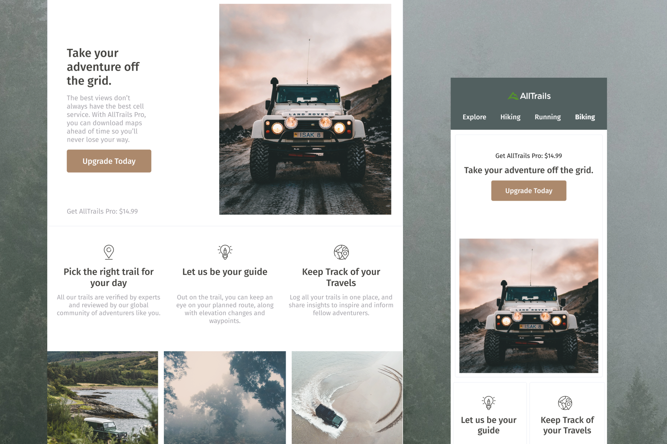 To address a gap in engagement, I developed a comprehensive email marketing campaign for an off-roading supply company, strategically aligned with an outdoor trails app to boost contextual relevance and user value. The campaign positioned products as essential tools for real-world adventures, using nature-inspired visuals and motivational, informative messaging to resonate with the off-roading lifestyle. Designed for seamless use across desktop and mobile, the experience ensured brand consistency and minimized friction for users on the go. Early-stage wireframes guided layout and content prioritization, resulting in a design that balanced aesthetic appeal with functionality. Overall, the campaign delivered a personalized, immersive experience that strengthened brand identity and increased user engagement.